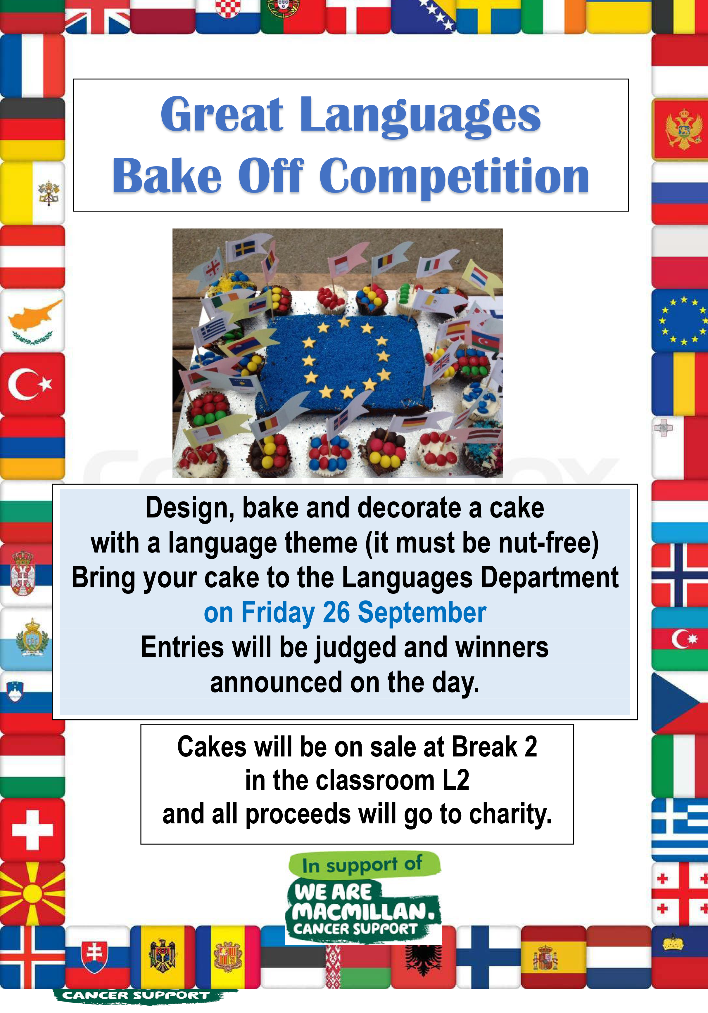 Students are invited to take part in the 'Great Languages Bake Off' on Friday 26th September. This competition is organised by the MFL Department to celebrate the European Day of Languages and the cake sale at Break 2 will be in aid of the charity 'Macmillan cancer support'.